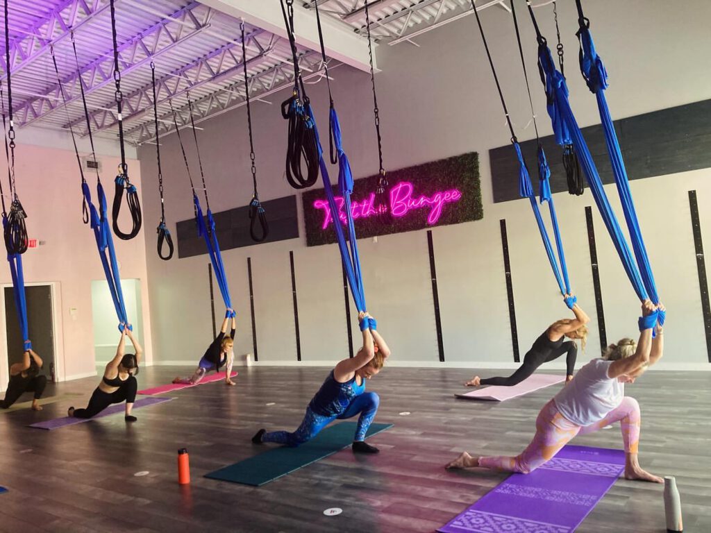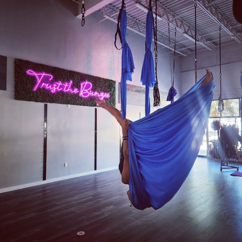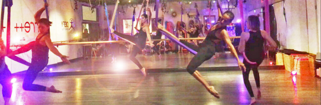 I was diagnosed with end stage Osteoarthritis of the Hips and Cervical Spine and told the only way to fully eliminate the pain and impairment was with surgeries, namely THR & Discectomy and Fusion. My goal was to strengthen all of the surrounding muscles to prevent atrophy, and also find some way to keep moving to maintain bone density. I found that Aerial Yoga decompressed the joints and spine , enough to open the spaces to allow blood flow. I also found, the Bungee System was a way to get light impact needed for bone remineralization as well as, a way to build tone thru full body muscle activation. I use these suspended practices to heal myself and others and I call this training “Move Up” . These modalities benefitted me greatly, however, I was still yearning for the creativity, and transcendence that dance provided. I began to experiment with sequences in the silk hammocks to fulfill this desire. I applied the same principles that I used in concert dance choreography and then shared it with others and out of that evolved AerDance……….